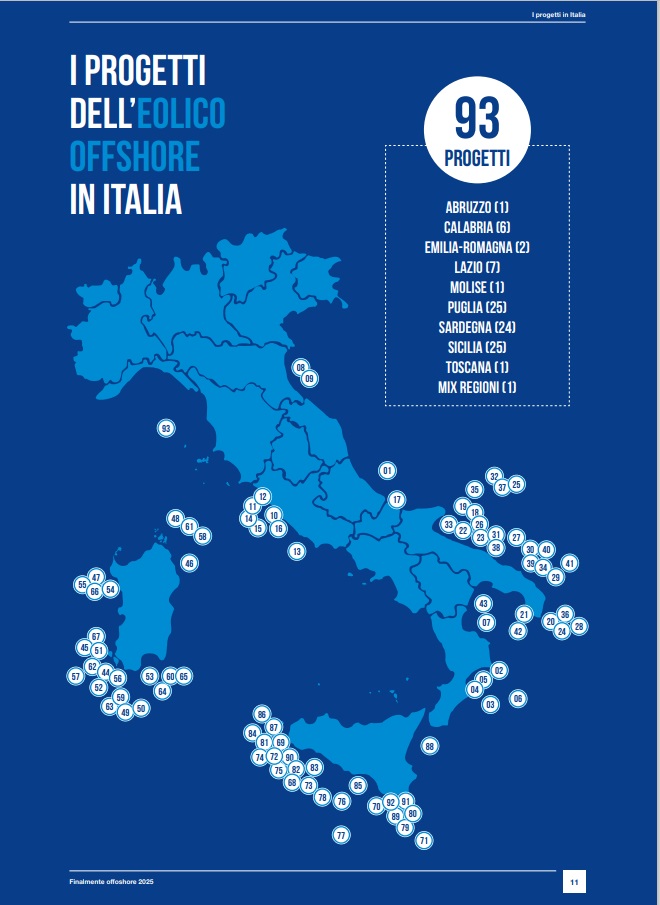 In Italia ad oggi, secondo la mappatura realizzata da Legambiente, sono 93 i progetti presentati dalle imprese del settore, distribuiti tra dieci regioni, per complessivi 74 GW. Di questi 93 progetti, che oggi sono nelle diverse fasi autorizzative al Ministero dell’Ambiente e della Sicurezza Energetica, ben 88, sono di tipo galleggiante, con una distanza media dalla costa di 32,7 km. Gli altri restati progetti a tecnologia “fissa”, presentano una distanza media dalla costa di 9,9 km.